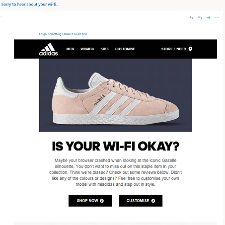 The subject line reads, "Sorry to hear about your wi-fi." A statement like this is bound to catch the eye of even the most wearied scroller. Whether it's out of concern or curiosity, customers will open the email to see what information it holds. Adidas does well to continue the theme and seems genuinely concerned when they query in large letters, "Is your wi-fi okay?" The abandoned cart text followed by the image of the lone Gazelle running shoe makes a strong argument. Only someone having a technical malfunction would pass on purchasing their excellent product.