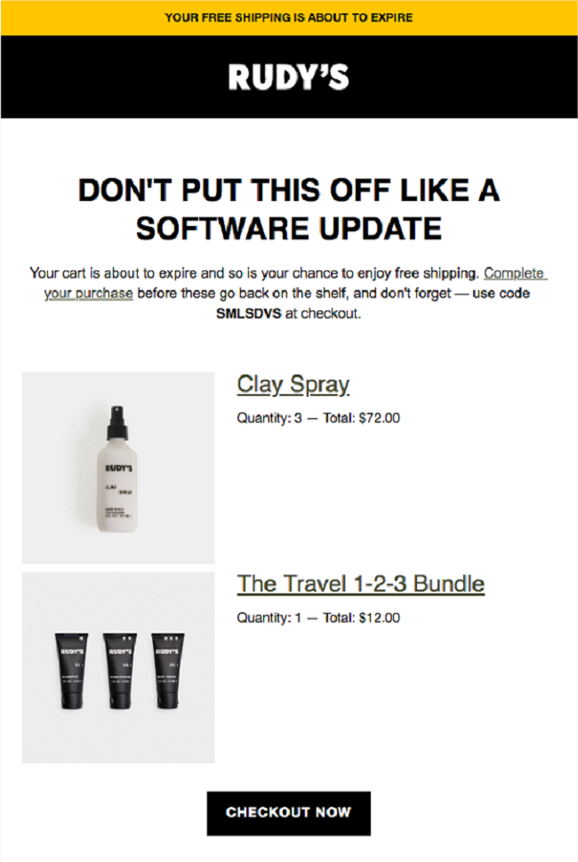 Rudy's gets this right. They tell the customer to complete the purchase right away, or they will miss out on free shipping. Since we know additional costs are a contributing factor to high abandoned cart rates, this could entice someone to finish their purchase sooner rather than later. You can even offer to hold their products in their cart for a limited amount of time.